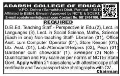 Brief Information: Adarsh College Of Education Panipat Vacancy 2026. Adarsh College of Education, V.P.O. Dehra (Samalkha), Panipat, affiliated with BSEH, Bhiwani and approved by NCTE & SCERT, Gurugram, has invited offline applications for the Manager Posts. Interested Candidates can fill out the Offline form. For More Jobs Like Haryana‘s Latest Job 2026, Delhi‘s latest Government Job 2026, and Haryana Kaushal Rojgar Nigam Vacancy 2026, please visit Ladolaxmischeme.com regularly. The details of the Adarsh College of Education Panipat Vacancy 2026, including the application form, age limit, qualification, and other relevant information, are provided below.