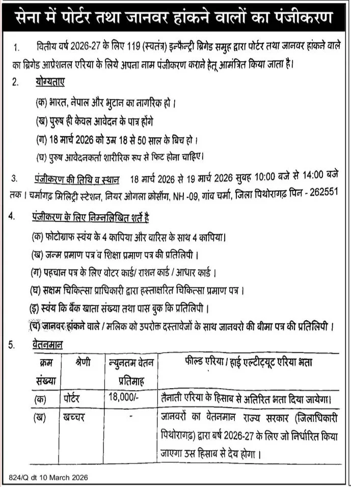 - Reach Charmagarh Military Station Near Okhla Crossing, NH-09 Village – Charma District – Pithoragarh, Uttarakhand – 262551 on 18 or 19 March 2026.