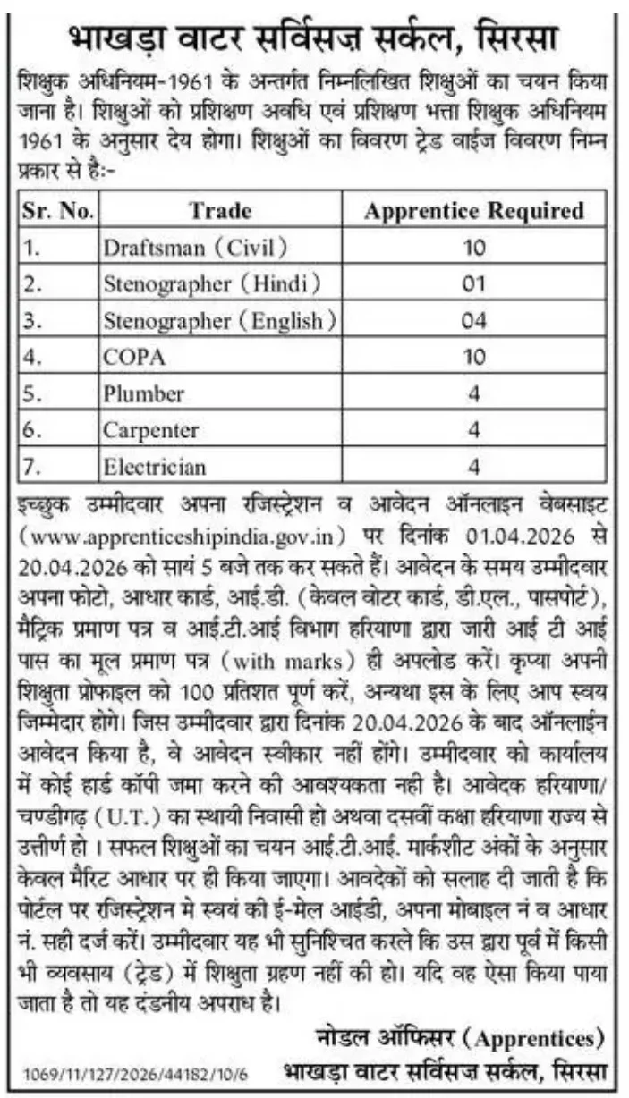 Brief Information: BWS Sirsa Apprentice Online Form 2026. The Bhakra Water Services Circle, Sirsa, has invited online applications for the Various Trade Apprentice Posts. Interested Candidates can fill out the Online form. For More Jobs Like Haryana‘s Latest Job 2026, Delhi‘s latest Government Job 2026, and Haryana Kaushal Rojgar Nigam Vacancy 2026, please visit Ladolaxmischeme.com regularly. The details of the BWS Sirsa Apprentice Online Form 2026, including the application form, age limit, qualification, and other relevant information, are provided below.