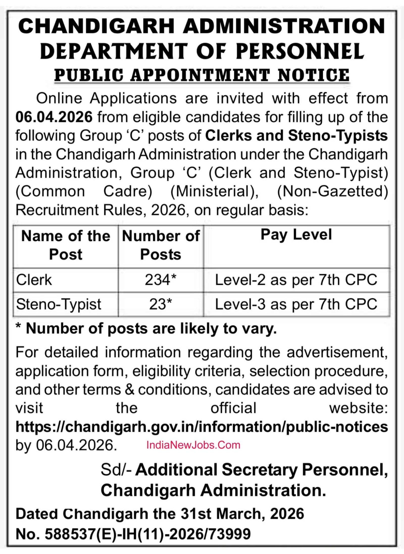 Brief Information: Chandigarh Administration Clerk Steno Vacancy 2026. The Chandigarh Administration has invited online applications for the Clerk and Steno-Typist Posts. Interested Candidates can fill out the Online form. For More Jobs Like Haryana‘s Latest Job 2026, Delhi‘s latest Government Job 2026, and Haryana Kaushal Rojgar Nigam Vacancy 2026, please visit Ladolaxmischeme.com regularly. The details of the Chandigarh Administration Clerk Steno Vacancy 2026, including the application form, age limit, qualification, and other relevant information, are provided below.