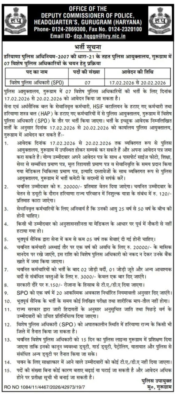 Brief Information: Haryana Police SPO Vacancy 2026. Haryana Police Department, Gurugram, Haryana has invited offline applications for 07 SPO (Special Police Officer) for Gurugram District. Interested Candidates can fill out the Offline form. For More Jobs Like Haryana‘s Latest Job 2026, Delhi‘s latest Government Job 2026, and Haryana Kaushal Rojgar Nigam Vacancy 2026, please visit Ladolaxmischeme.com regularly. The details of the Haryana Police SPO Vacancy 2026, including the application form, age limit, qualification, and other relevant information, are provided below.