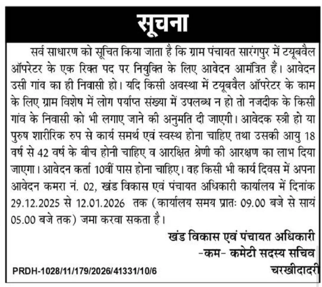 Brief Information: Haryana Tubewell Operator Vacancy 2025. Block Development and Panchayat Department, Charkhi Dadri (District Charkhi Dadri) has invited online applications for the Tubewell (जलकर्मी) Operator on a contract basis for various villages of Charkhi Dadri District. Interested Candidates can fill out the Online form. For More Jobs Like Haryana’s Latest Job 2025, Delhi’s latest Government Job 2025, and Haryana Kaushal Rojgar Nigam Vacancy 2025, please visit Ladolaxmischeme.com regularly. The details of the Haryana Tubewell Operator Vacancy 2025, including the application form, age limit, qualification, and other relevant information, are provided below.