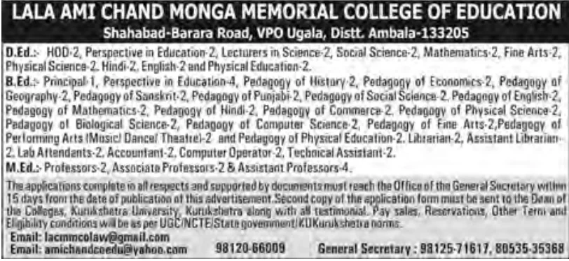 Brief Information: Lala Ami Chand Monga Memorial College Ambala Vacancy 2026. The Lala Ami Chand Monga Memorial College of Education, Ugala (Ambala), affiliated with KUK University, Rohtak, has invited offline applications for the Various Non-Teaching Posts. Interested Candidates can fill out the Offline form. For More Jobs Like Haryana‘s Latest Job 2026, Delhi‘s latest Government Job 2026, and Haryana Kaushal Rojgar Nigam Vacancy 2026, please visit Ladolaxmischeme.com regularly. The details of the Lala Ami Chand Monga Memorial College Ambala Vacancy 2026, including the application form, age limit, qualification, and other relevant information, are provided below.