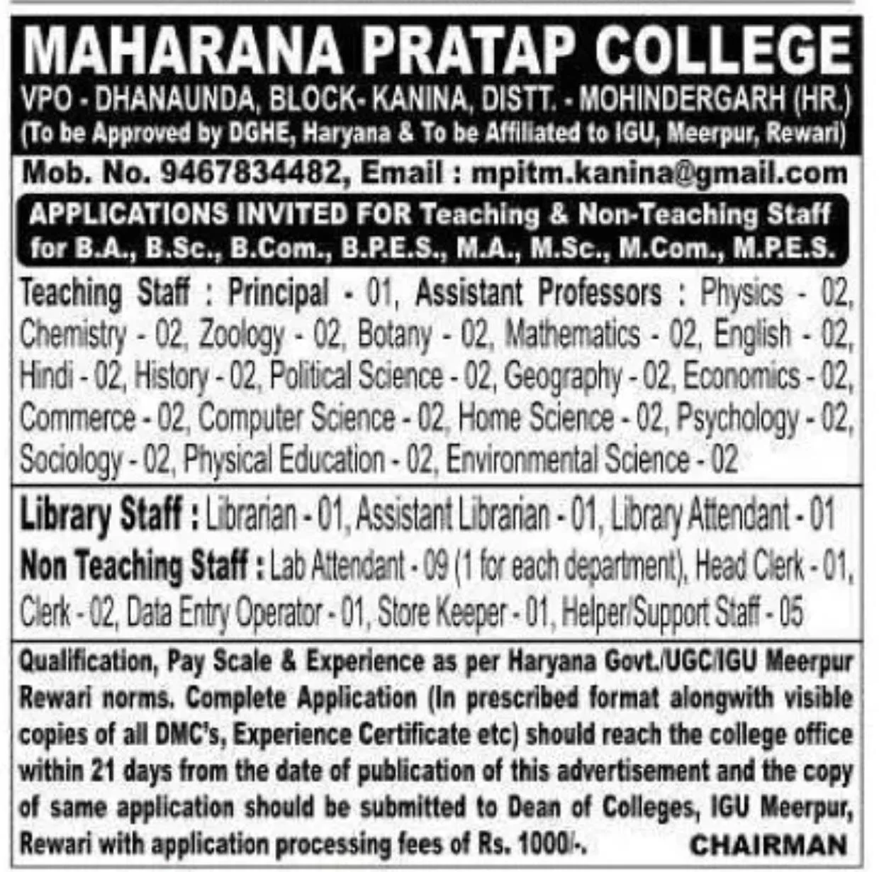 Brief Information: Maharana Pratap College Mahendergarh Offline Form 2026. The Maharana Pratap College, Kanina (Mahendergarh, Haryana), affiliated with IGU Meerpur Rewari, has invited offline applications for various non-teaching posts. Interested Candidates can fill out the Offline form. For More Jobs Like Haryana‘s Latest Job 2026, Delhi‘s latest Government Job 2026, and Haryana Kaushal Rojgar Nigam Vacancy 2026, please visit Ladolaxmischeme.com regularly. The details of the Maharana Pratap College, Mahendergarh Offline Form 2026, including the application form, age limit, qualification, and other relevant information, are provided below.