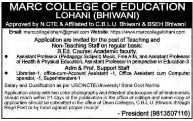 Brief Information: MARC College Of Education Bhiwani Vacancy 2026. The Marc College of Education Lohani (Bhiwani), affiliated with CBLU University, Bhiwani, has invited offline applications for the various non-teaching positions. Interested Candidates can fill out the Offline form. For More Jobs Like Haryana‘s Latest Job 2026, Delhi‘s latest Government Job 2026, and Haryana Kaushal Rojgar Nigam Vacancy 2026, please visit Ladolaxmischeme.com regularly. The details of the MARC College Of Education Bhiwani Vacancy 2026, including the application form, age limit, qualification, and other relevant information, are provided below.