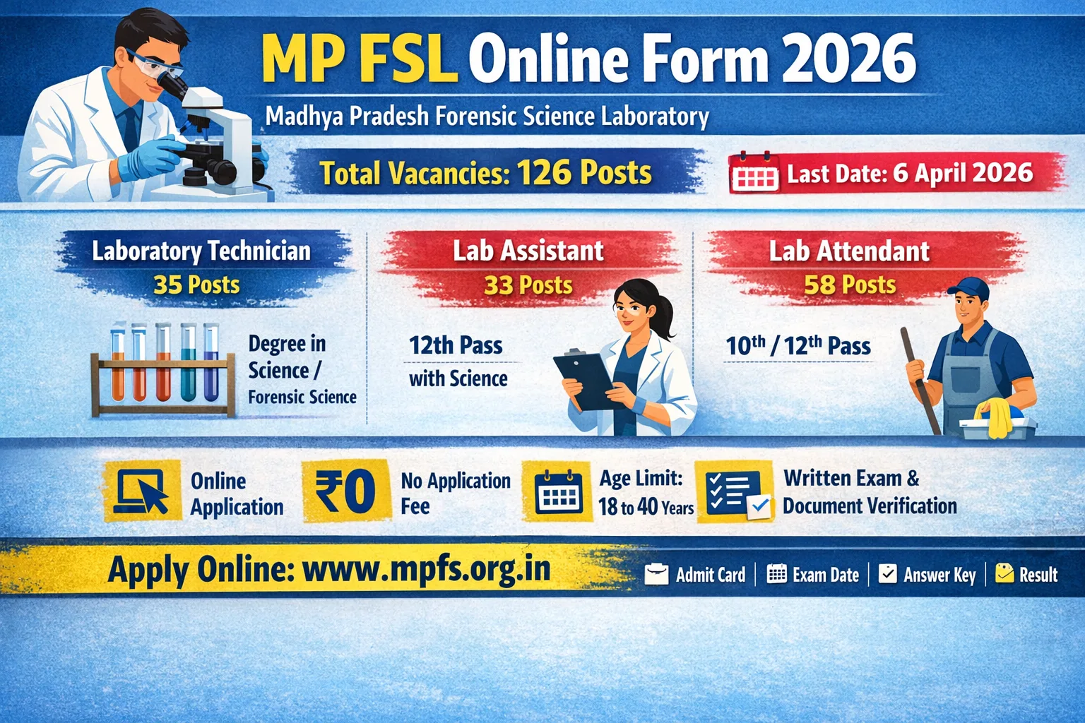 Brief Information: MP FSL Online Form 2026. The Madhya Pradesh Forensic Science Laboratory (FSL), Home (Police) Department has invited online applications for the Technician, Assistant, and Attendant Posts in Madhya Pradesh. Interested Candidates can fill out the Online form. For More Jobs Like Haryana‘s Latest Job 2026, Delhi‘s latest Government Job 2026, and Haryana Kaushal Rojgar Nigam Vacancy 2026, please visit Ladolaxmischeme.com regularly. The details of the MP FSL Online Form 2026, including the application form, age limit, qualification, and other relevant information, are provided below.