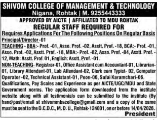 Recruitment Organization Shivom College of Management & Technology Post Name Various Non-Teaching Posts Total Post 23 Last Date 14 April 2026 Application Type Online By Email + Offline Official Website shivommbacollege.in Job Location Haryana Join Telegram Group CLICK HERE