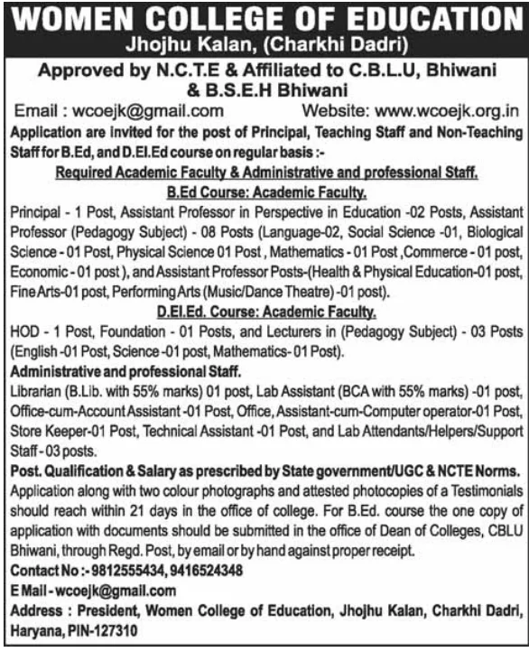 Send the complete application form to the following address: President Women’s College of Education, Jhojhu Kalan, Charkhi Dadri, Haryana – 127310